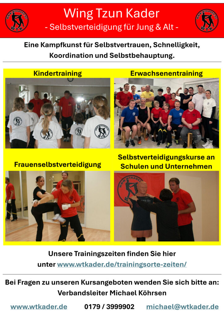 Fragen zu Frauenselbstverteidigungskursen, Kursen an Schulen oder in Unternehmen beantwortet Ihnen gerne Verbandsleiter Michael Köhrsen, 0179/3999902, michael@wtkader.de. |