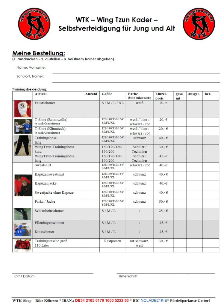 - Um eine zügige Bestellabwicklung gewährleisten zu können, drucken Sie sich bitte den WTK-Bestellschein aus und geben ihn ausgefüllt an Ihren Trainer weiter.