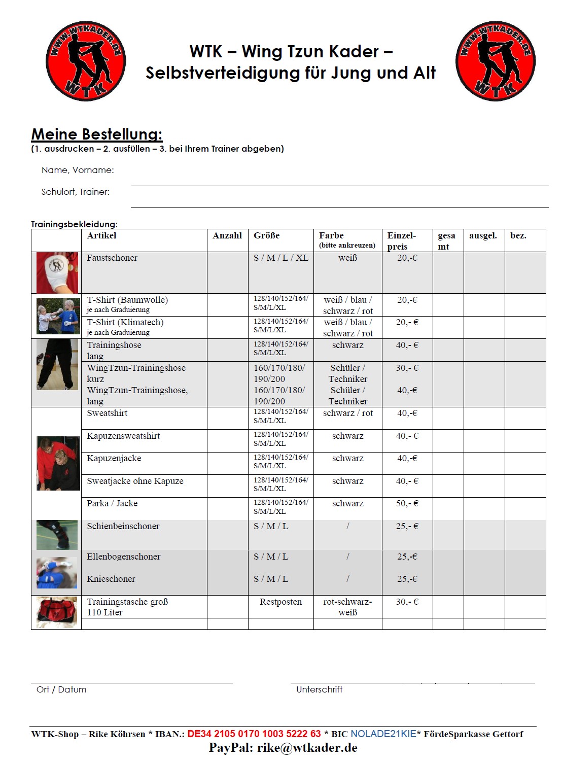 - Um eine zügige Bestellabwicklung gewährleisten zu können, drucken Sie sich bitte den WTK-Bestellschein aus und geben ihn ausgefüllt an Ihren Trainer weiter.